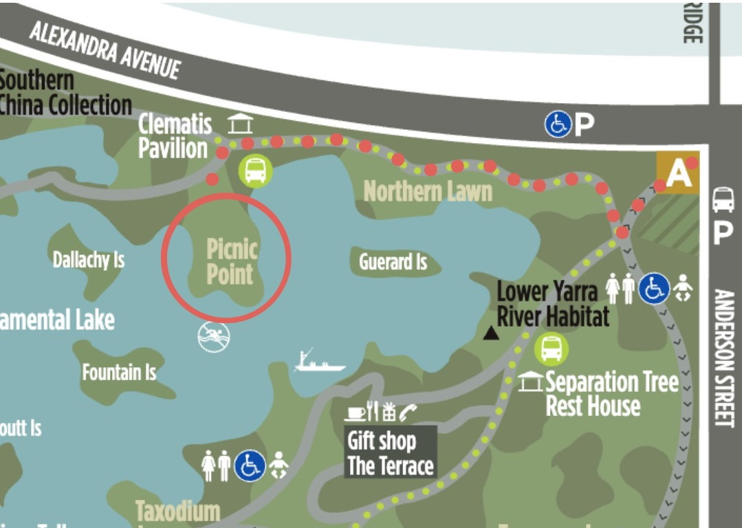 Please enter the gardens via Bridge Gate (corner of Alexandra Avenue & Anderson Street), and follow the red dots on the map to reach Picnic Point.